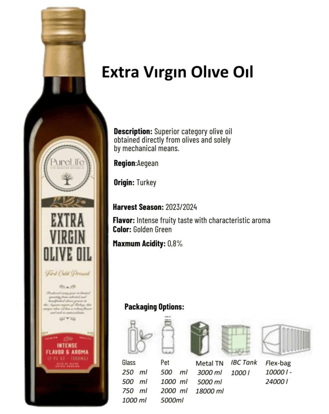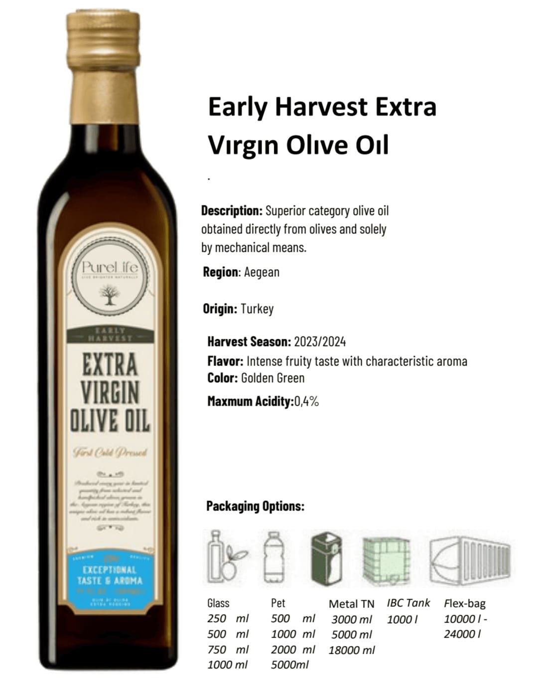 Purelife EVOO is a single-variety oil made from 100% Trilye olives. Harvested at peak